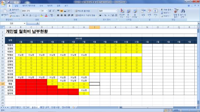 2013년 8월 현재 월회비 납부내역.
